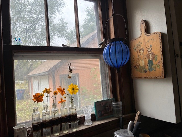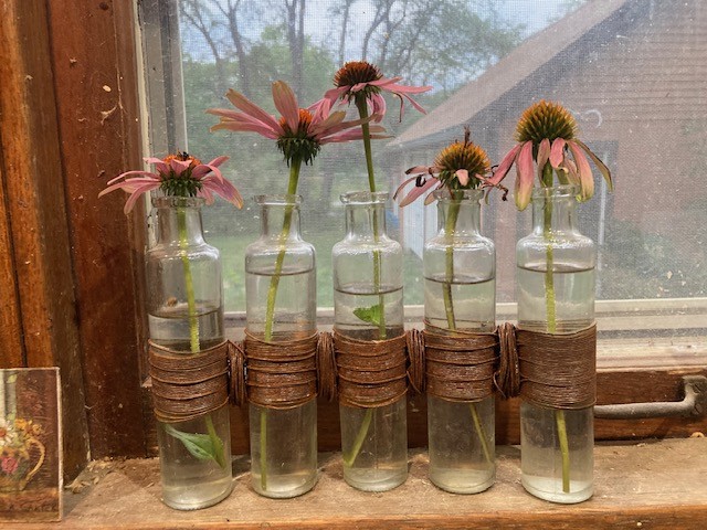 It was drizzling so we didn’t stay out long. The cone flowers were at their height and I told Tommy that he could point to the ones he wanted and I’d cut them. Inside I put them in that same “unique” vase. The flowers he picked weren’t ones I would have chosen, not being the most fresh and pretty. Rather some were starting to wilt, even with a few petals falling off. Never mind, I thought, as I could replace them as soon as they left and Tommy would never know. But in the end I decided to leave them, brown spots and all. Each time I saw them above the kitchen sink, I pictured me and a little boy out in the rain, picking flowers.
